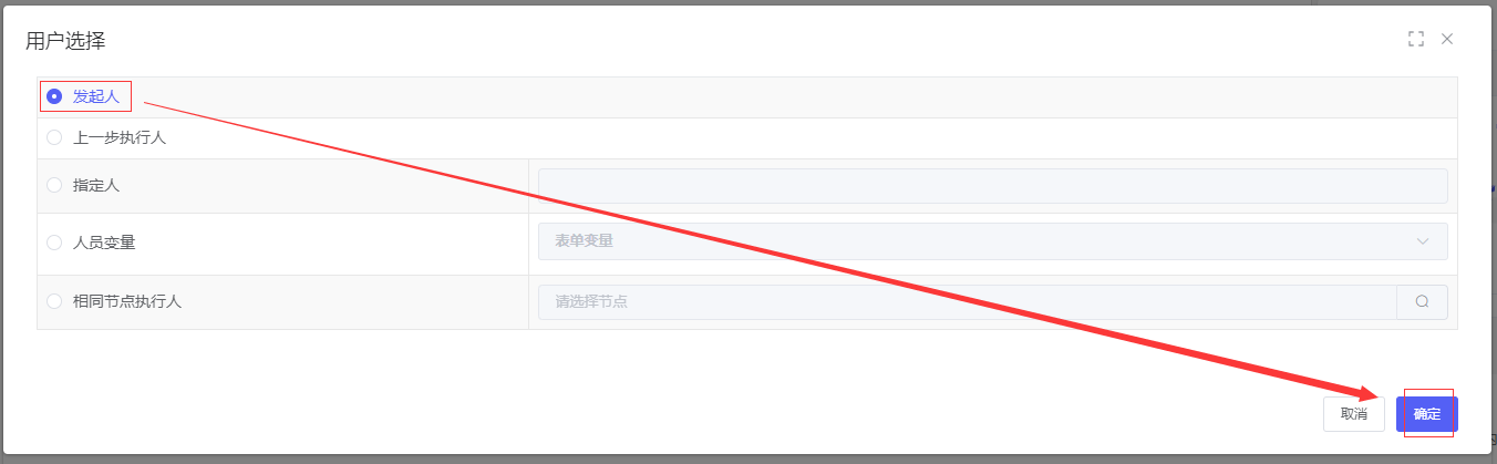 系统弹窗页面单选“发起人”信息后,点击右下角的“确定”按钮:
