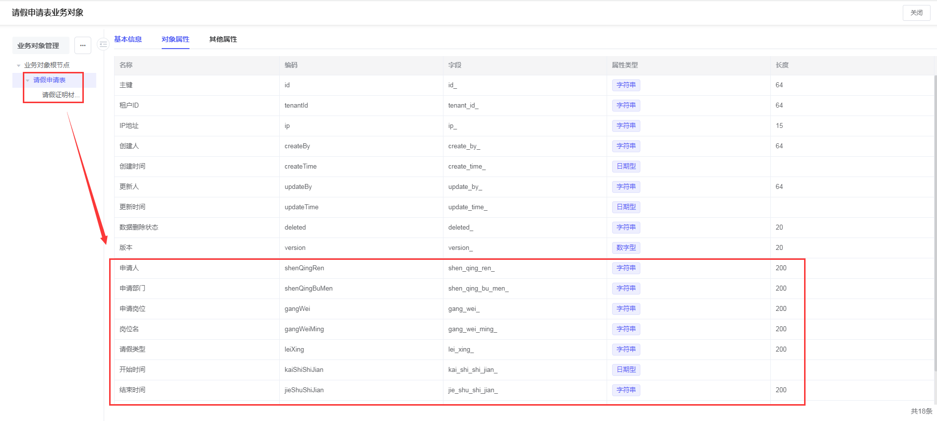 选择「表单管理>> 业务对象管理 >> 添加按钮」,设置业务对象名称为「请假申请表」,即可创建请假申请表的数据模型信息。