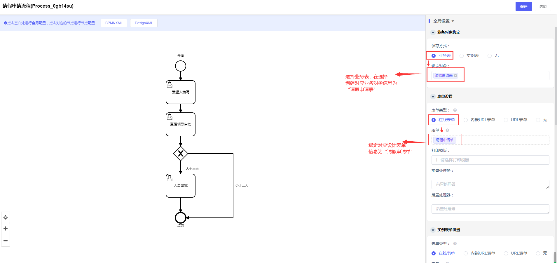 选择「工作流程>> 流程定义管理 >>选中刚设计的流程数据>>点击设置按钮(或直接进入流程设置页面)」,直接进入页面“全局布局”的“业务对象绑定”选择“业务表”,“绑定的对象”为设置业务对象信息为“请假申请表”,“表单设置”选择“在线表单”且在表单选择弹窗页面选择对应的“请假申请单”,如下图: