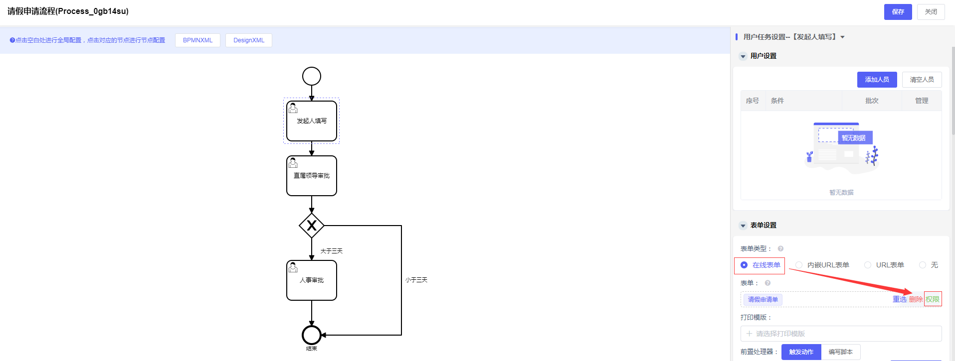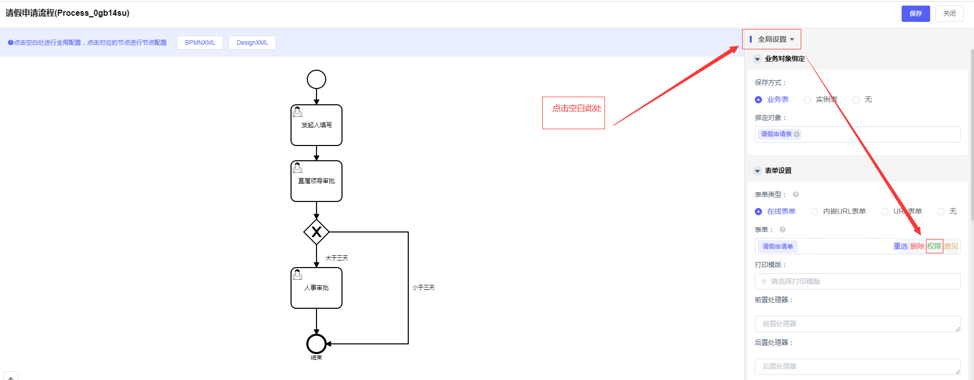 说明:若其他节点都是只读的话,直接在左边流程图点击空白区域,进入“全局设置”,选择“表单设置”-“表单类型”-“在线表单”对应的“请假申请单”在选择区域出现的“权限”字眼,只管勾选只读权限,其他为“无”: