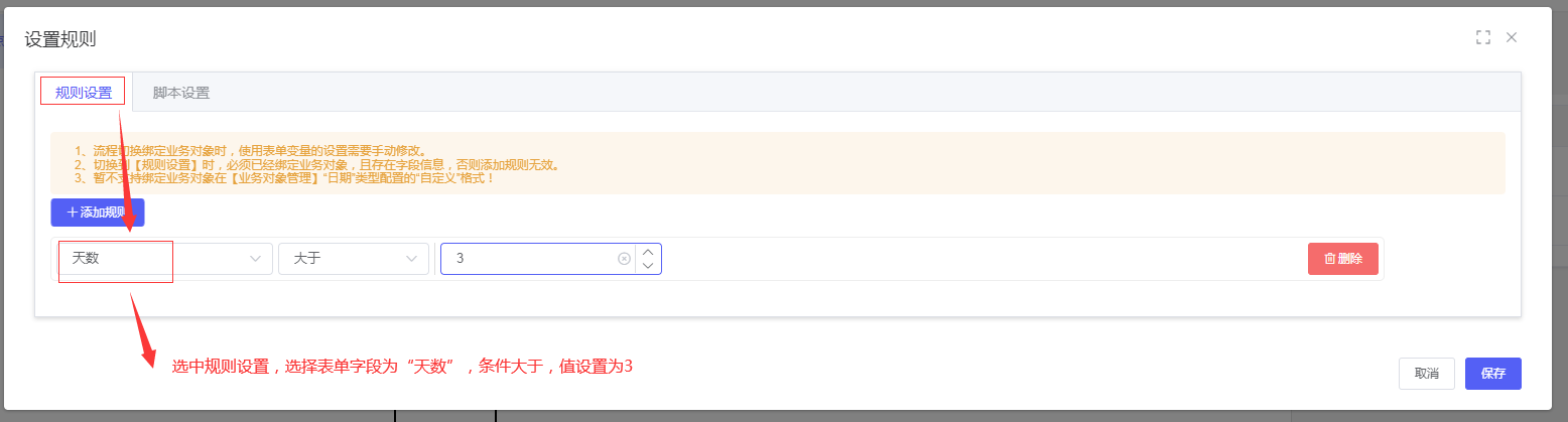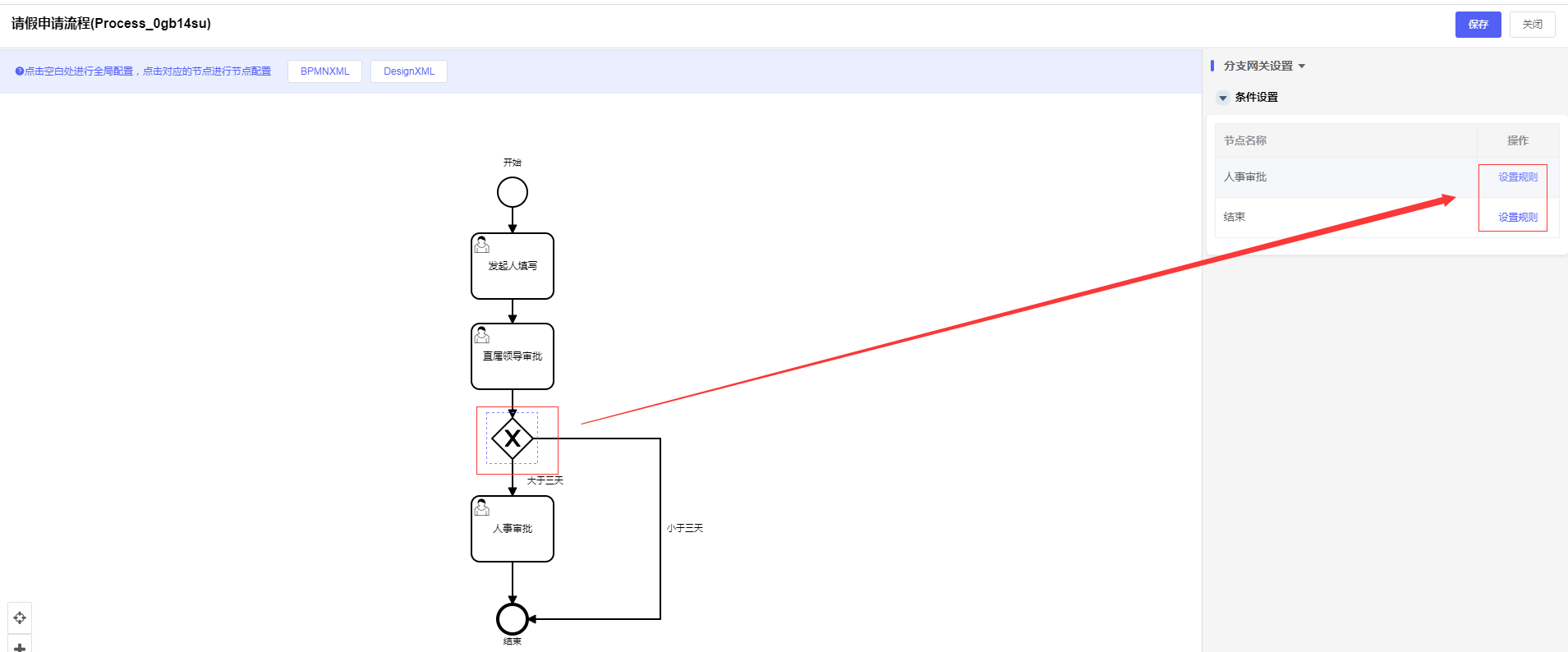 选择「工作流程>> 流程定义管理 >>选中刚设计的流程数据>>点击设置按钮(或直接进入流程设置页面)」,在左边流程图页面,选中“分支网关”,右边进入分支网关设置,选择“人事审批”点击“设置规则”条件为:大于三天,选择“结束”点击“设置规则”条件为:小于三天,配置“规则设置”条件配置完成后,点击“保存”按钮(小窗口保存按钮点击完后,外面大窗口的保存按钮也一定要点击不然数据是不会入库),如下图: