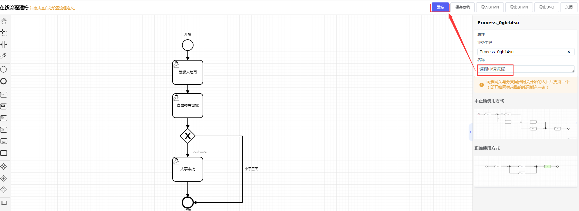 进入流程设计中,根据拆解的节点名称,选中节点修改节点名称,设计完节点信息以后,还需在右边区域的“名称”命名为“请假申请流程”的信息,最后点击右上角的“发布”按钮: