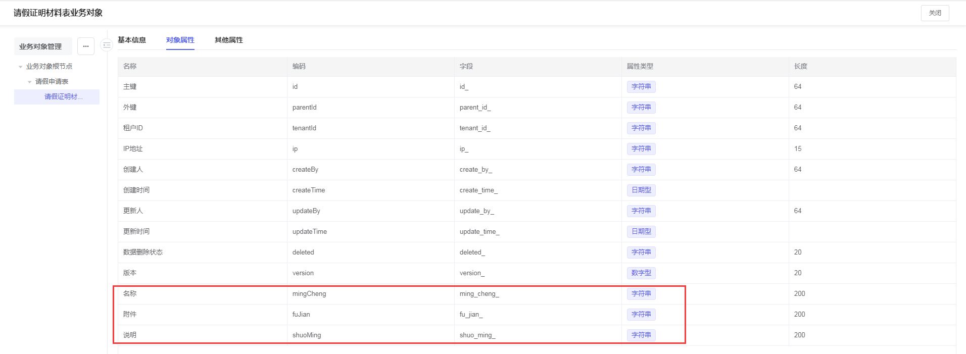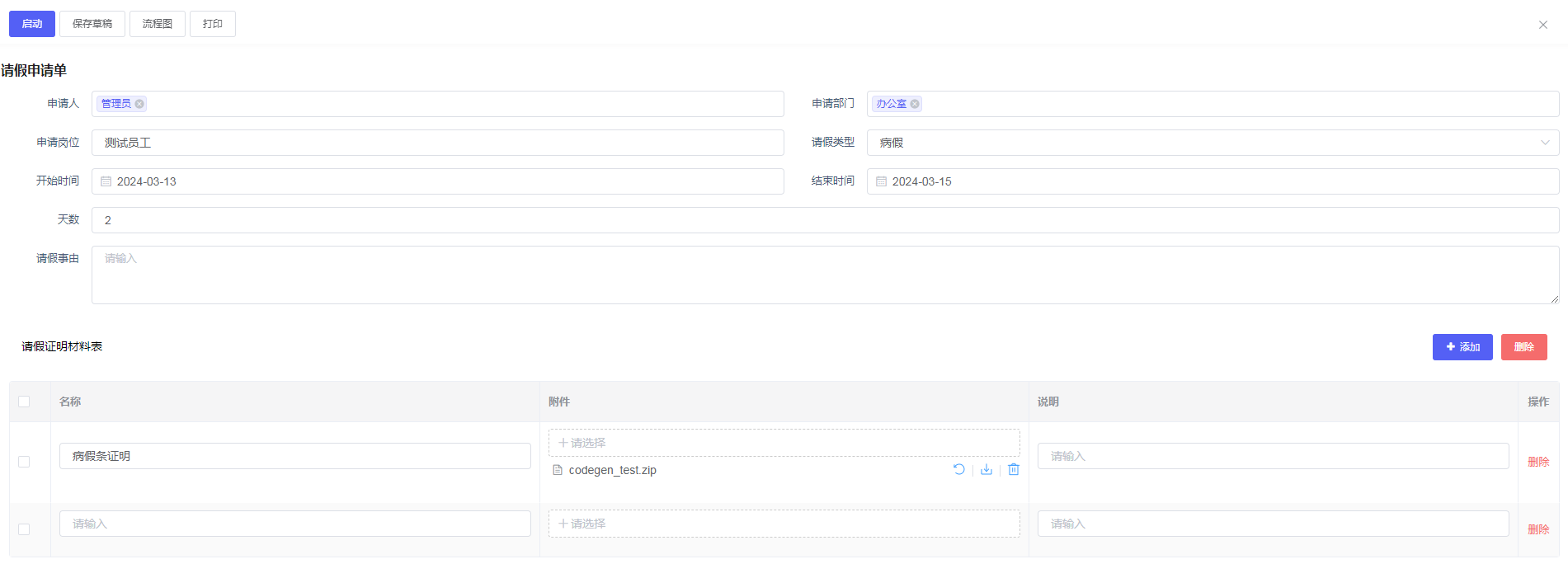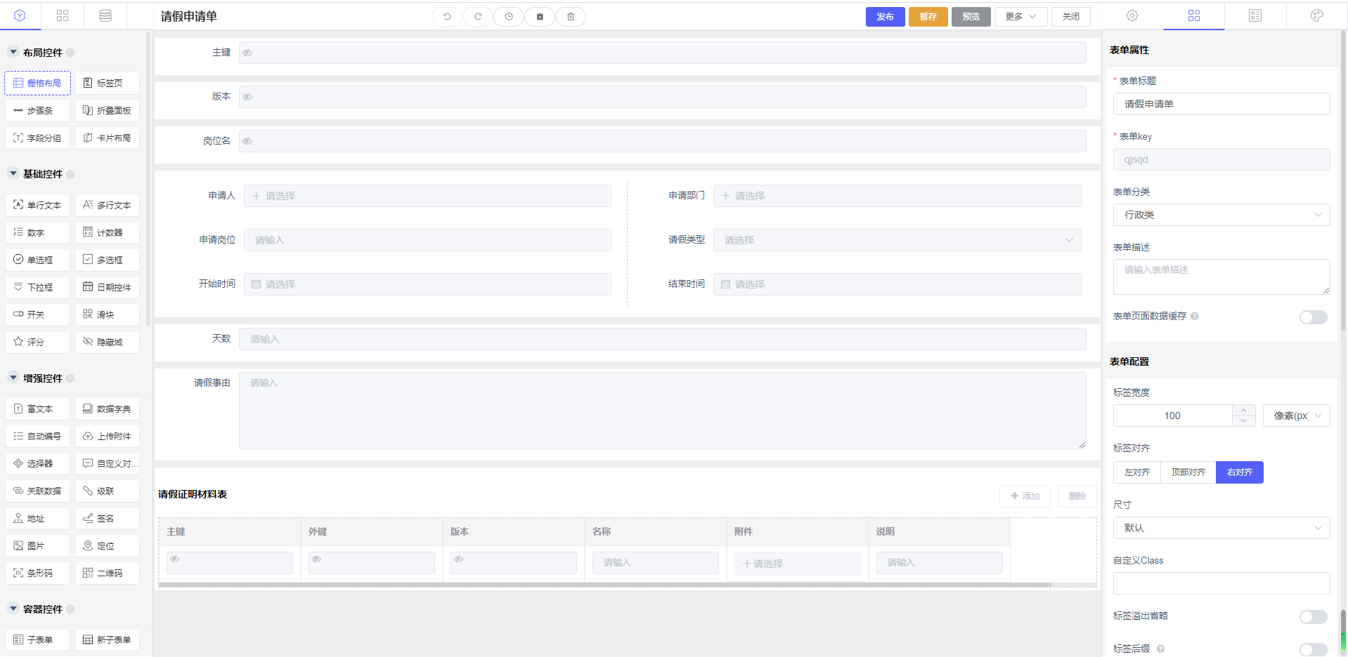 | 请假证明材料(添加下级业务对象) | 子表单 |
