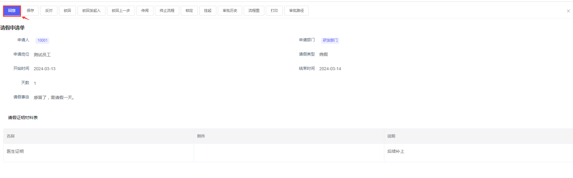 切换用户审批账户,进入待办事务,选择员工提交的请假申请流程进行审批,选择同意按钮,则认为审批通过。