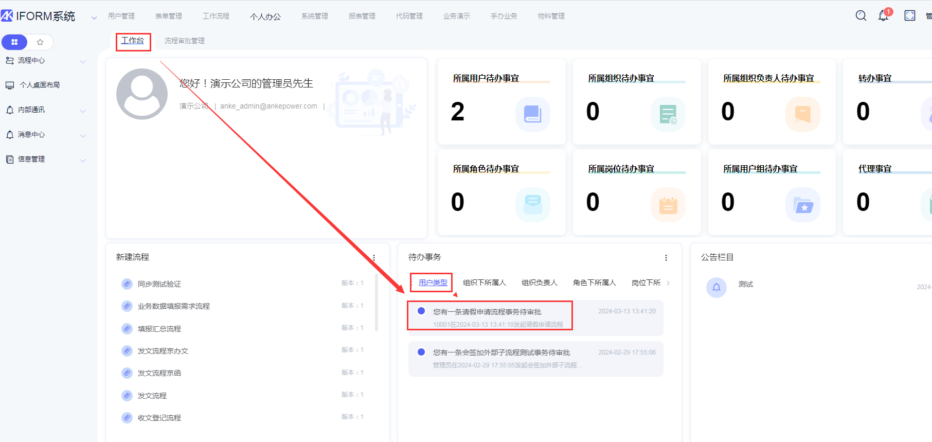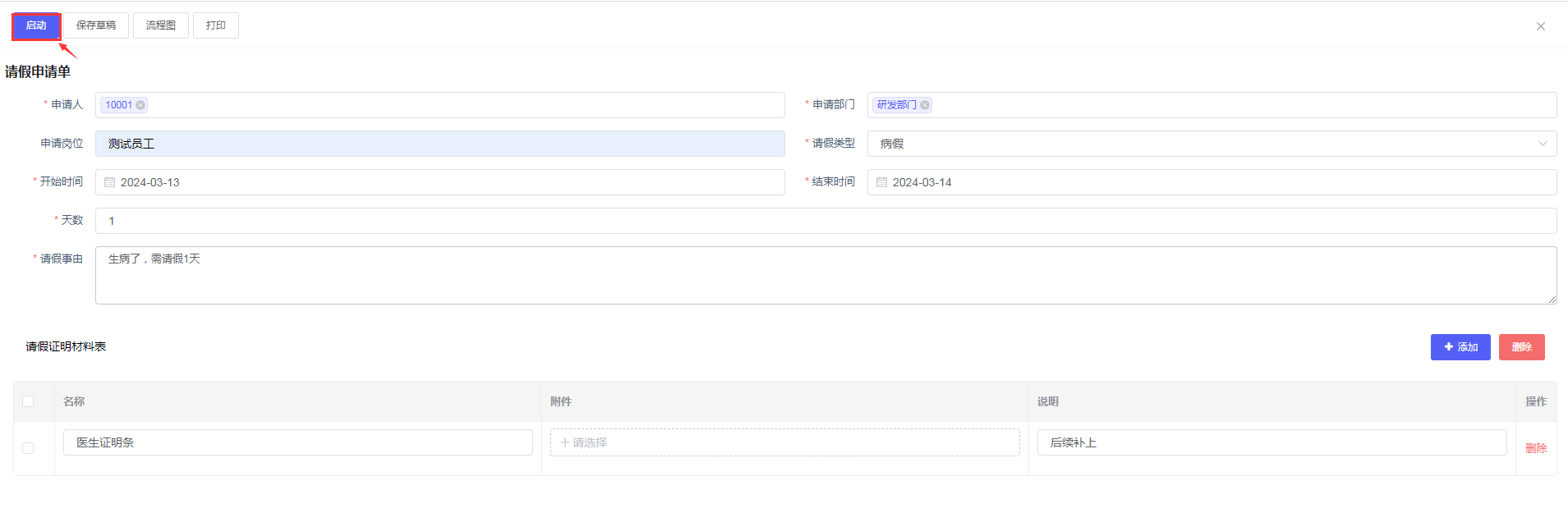 切换普通账户,比如:10001/1,选择「工作台>> 新建流程 >>点击请假申请流程」或选择「个人办公>> 流程中心 >>我申请的流程>>创建流程管理」选择“请假申请流程”点击流程名称超链接进入流程启动页面,输入业务数据,点击“启动”按钮,即可启用当前流程审批。