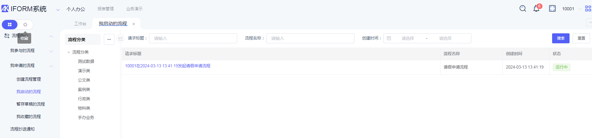 在10001账户,选择「个人办公>> 流程中心 >>我申请的流程>>我启动的流程」可以查看当前用户提交且状态为“正在运行中”的全部流程信息: