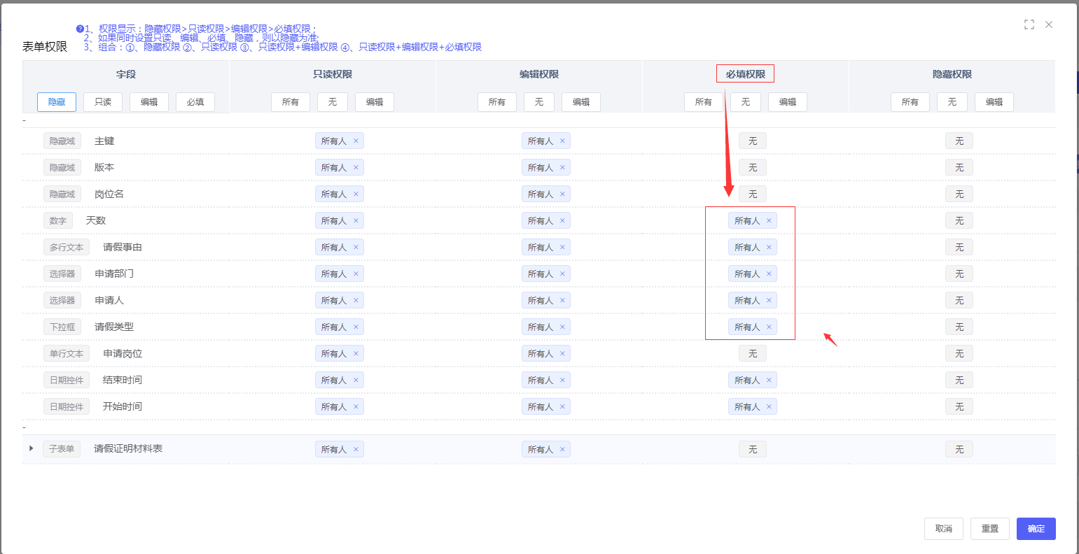 - 发起人填写: 配置表单字段权限全部可见、可编辑,且申请人、请假类型等为必填;