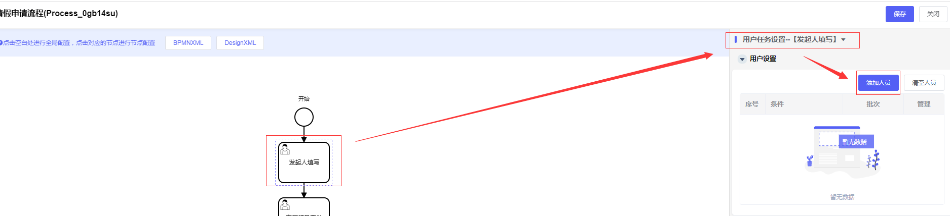 选择「工作流程>> 流程定义管理 >>选中刚设计的流程数据>>点击设置按钮(或直接进入流程设置页面)」,在左边流程图页面,选中“发起人填写”,右边进入单个节点设置区域,选择“发起人填写”-“用户任务设置”-“点击添加人员按钮”: