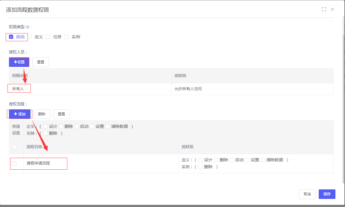 选择「工作流程>> 流程数据权限 >>点击添加按钮」,系统进入“添加流程数据权限”,权限类型选择“启动”,授权人员设置为“所有人”,授权流程添加“请假申请流程”,配置完成后,点击右下角“保存”按钮: