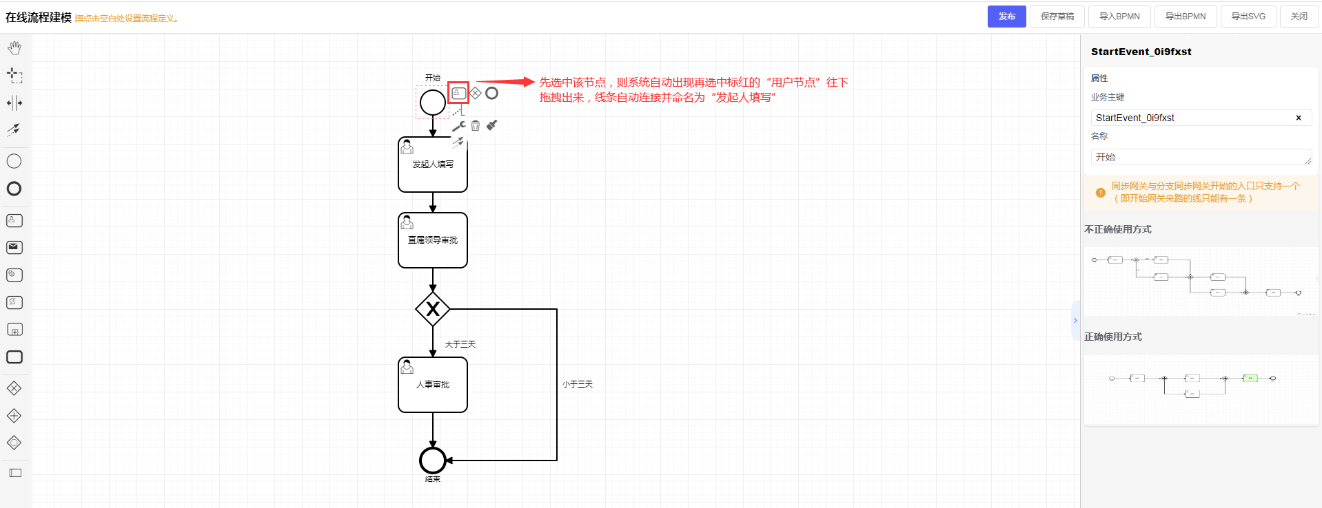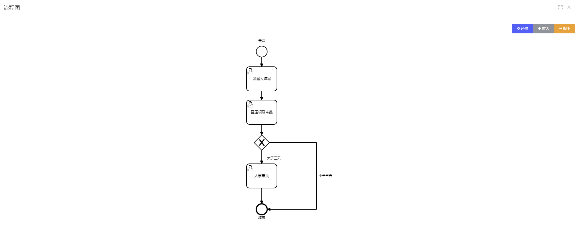 - 分支节点(增加条件判断:大于三天需要人事审批,小于三天直接结束)