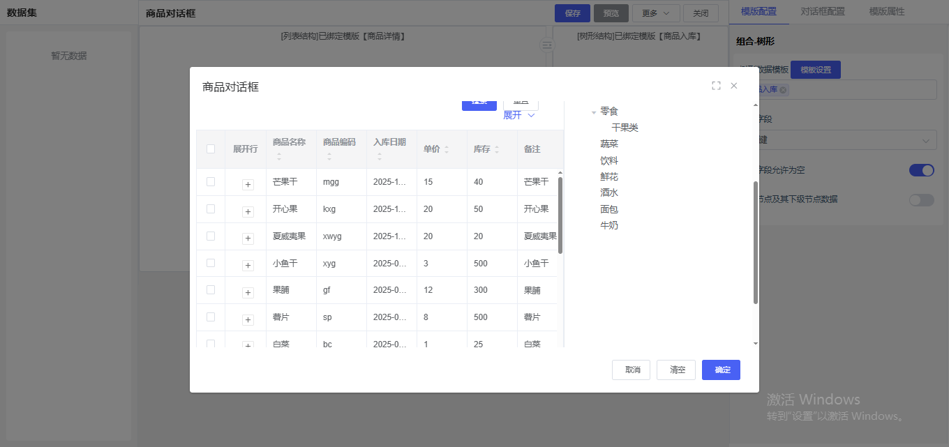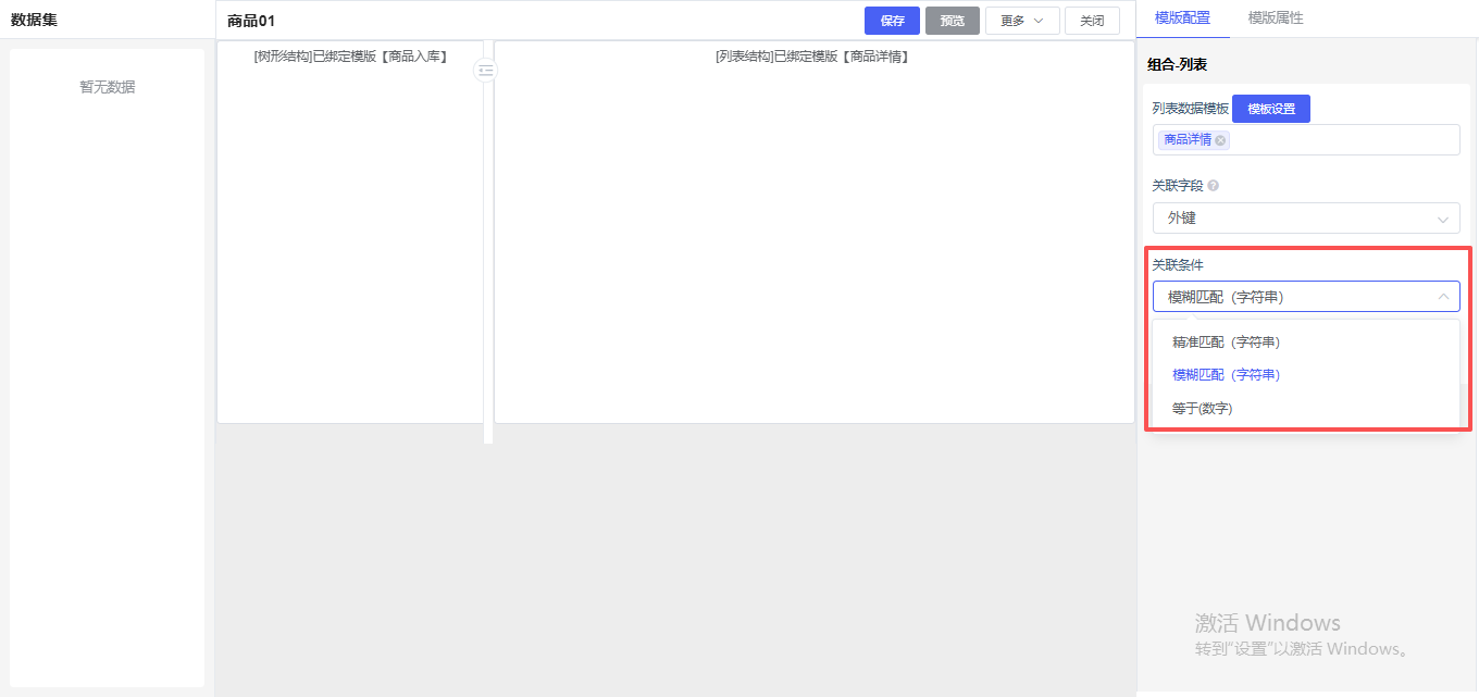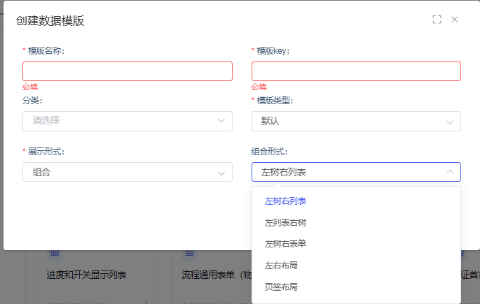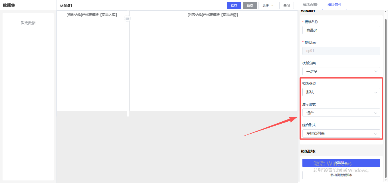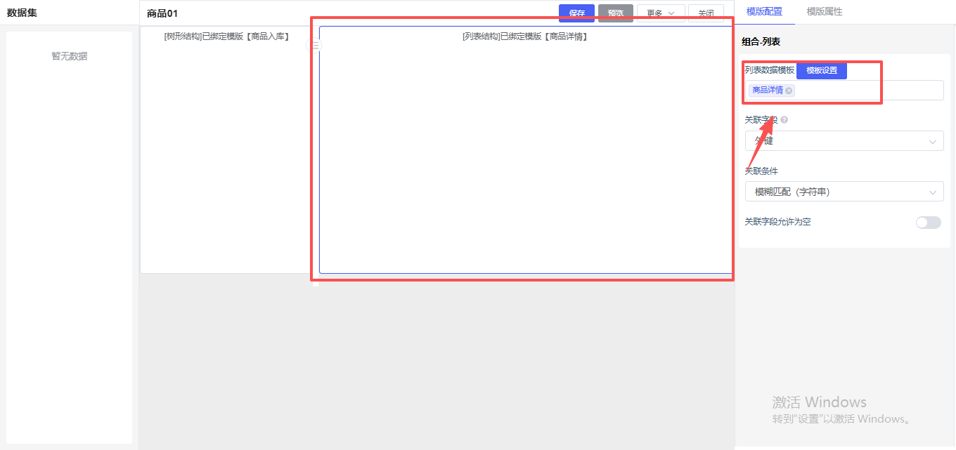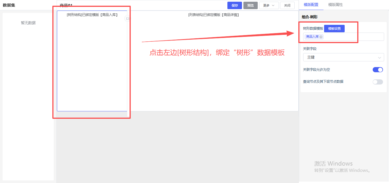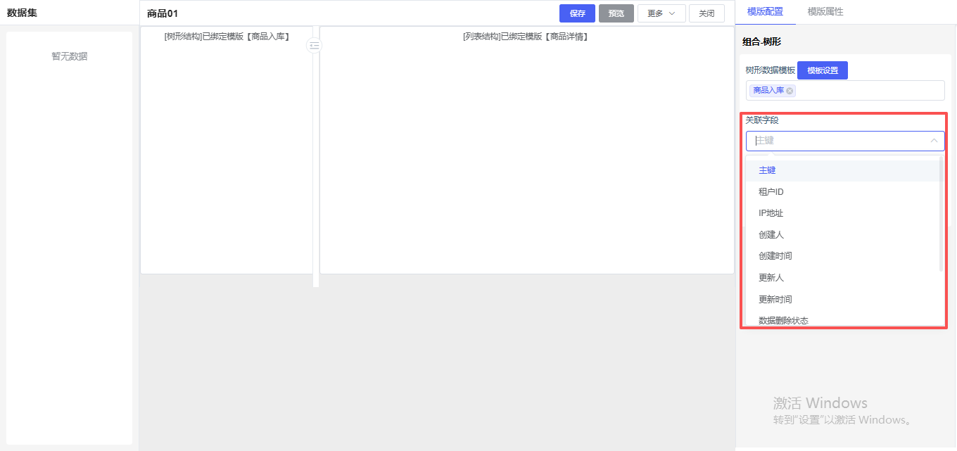 • 此页面配置组合-树形、组合-列表的数据模板和关联字段。通过树形与列表之间有个共同的字段值,组合配置实现。