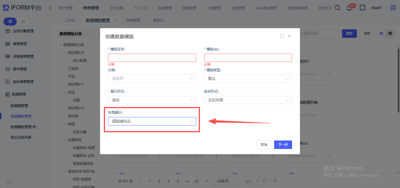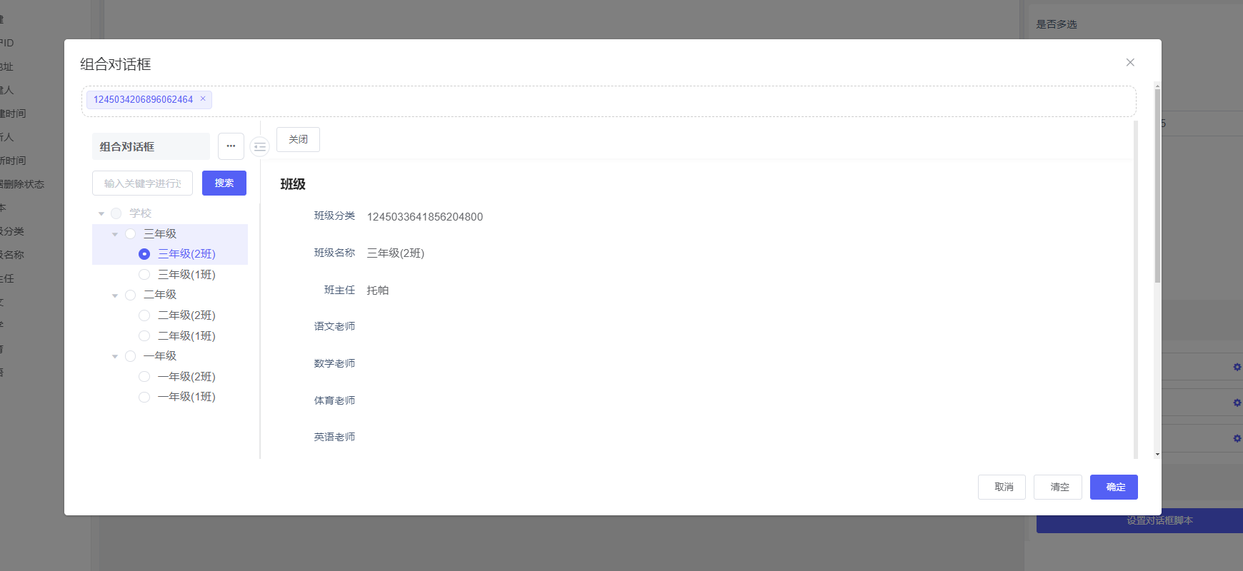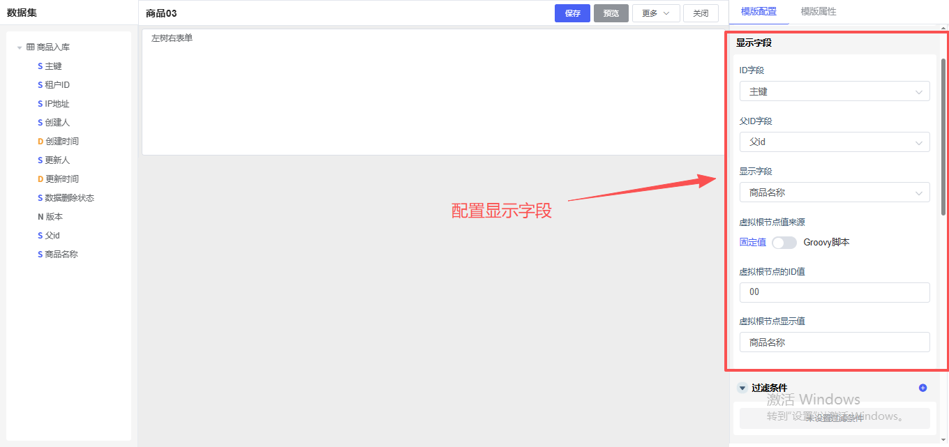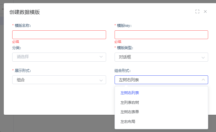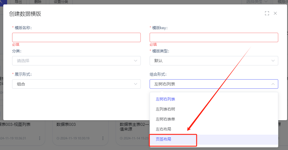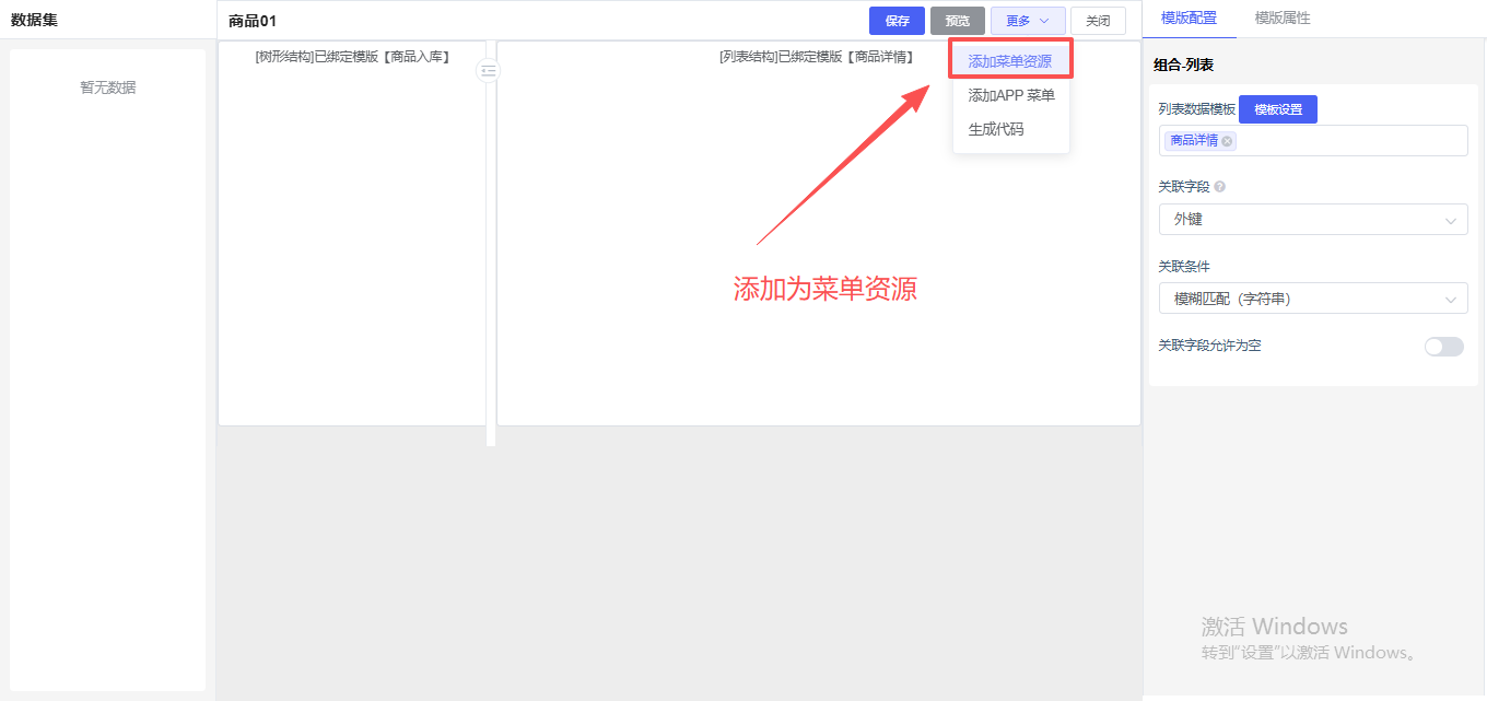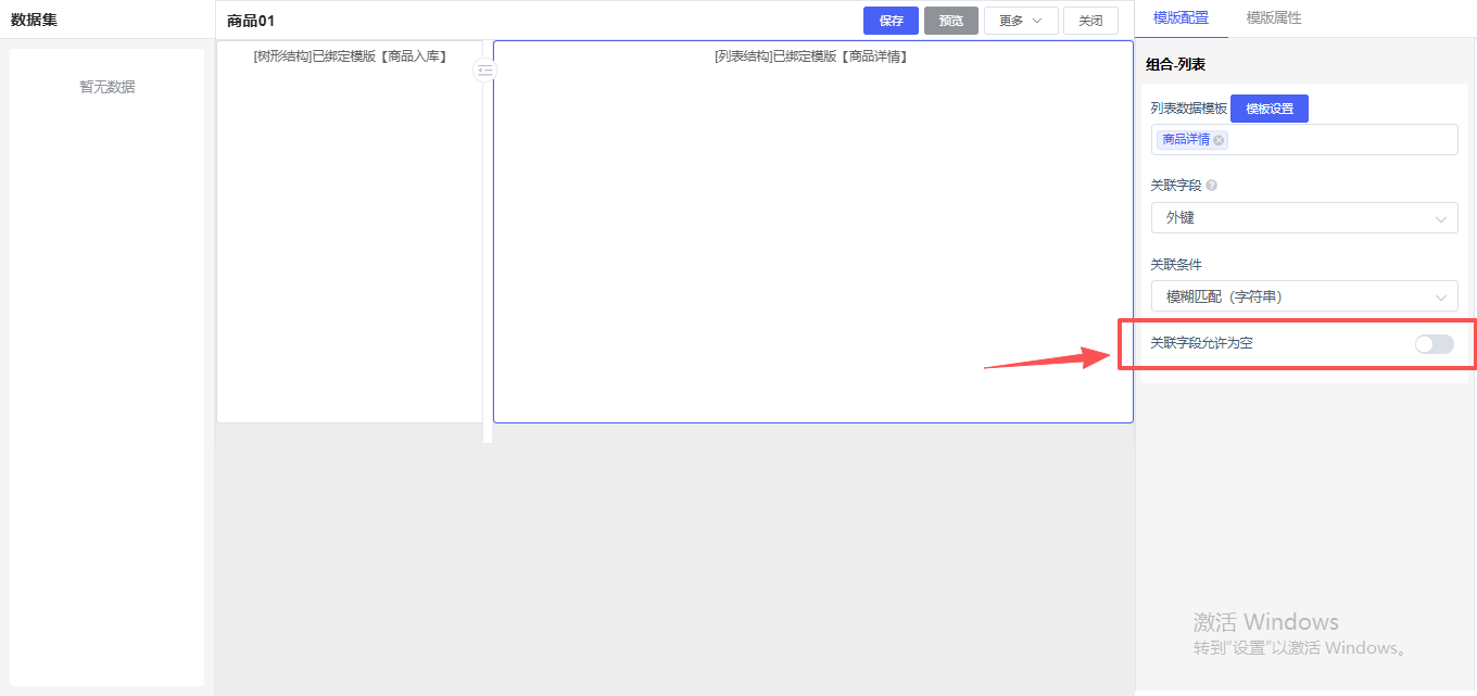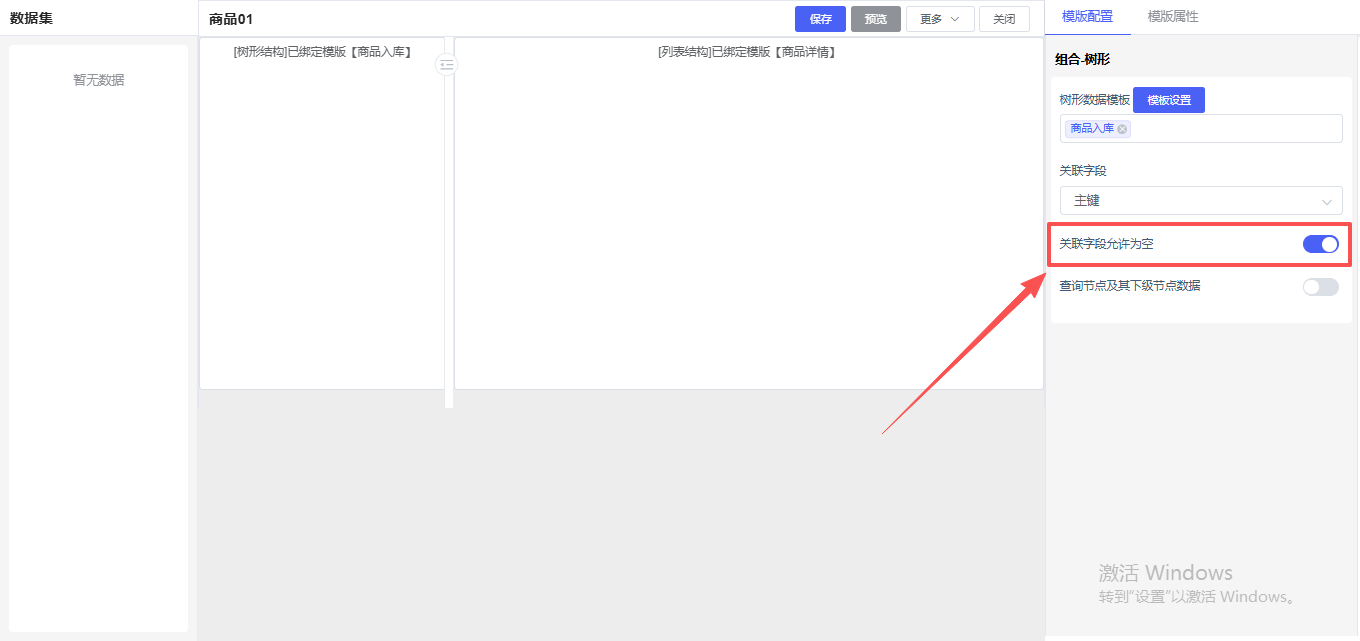 • 此页面配置组合-树形、组合-列表的数据模板和关联字段。通过树形与列表之间有个共同的字段值,组合配置实现。