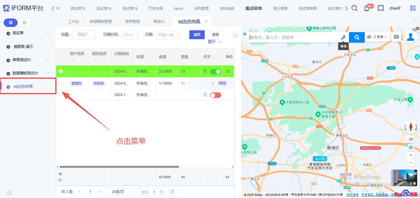 • 菜单中显示组合(左树右列表,左列表右树、左树右表单、左右布局、页签布局)效果,类似『流程管理』或『表单管理』菜单效果。
