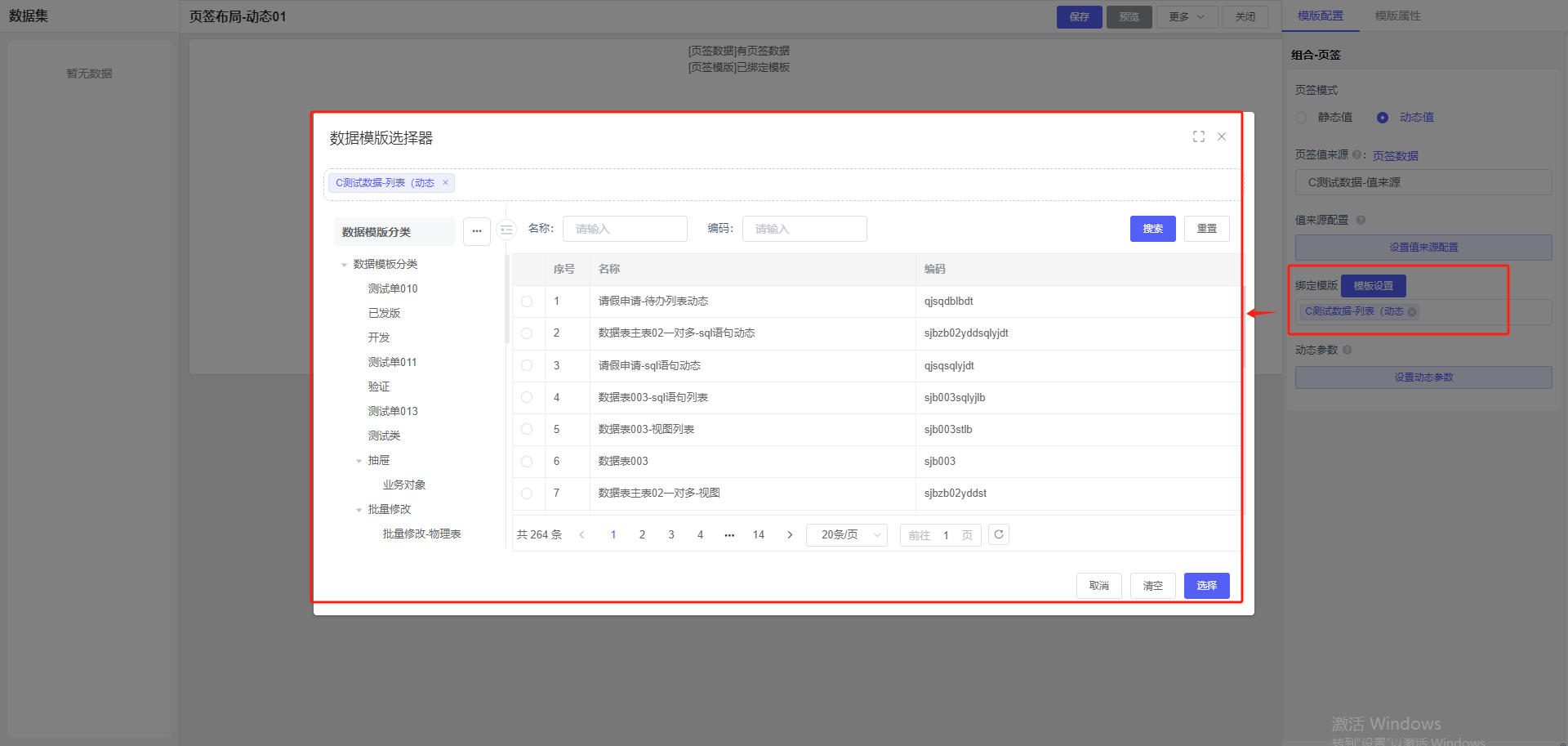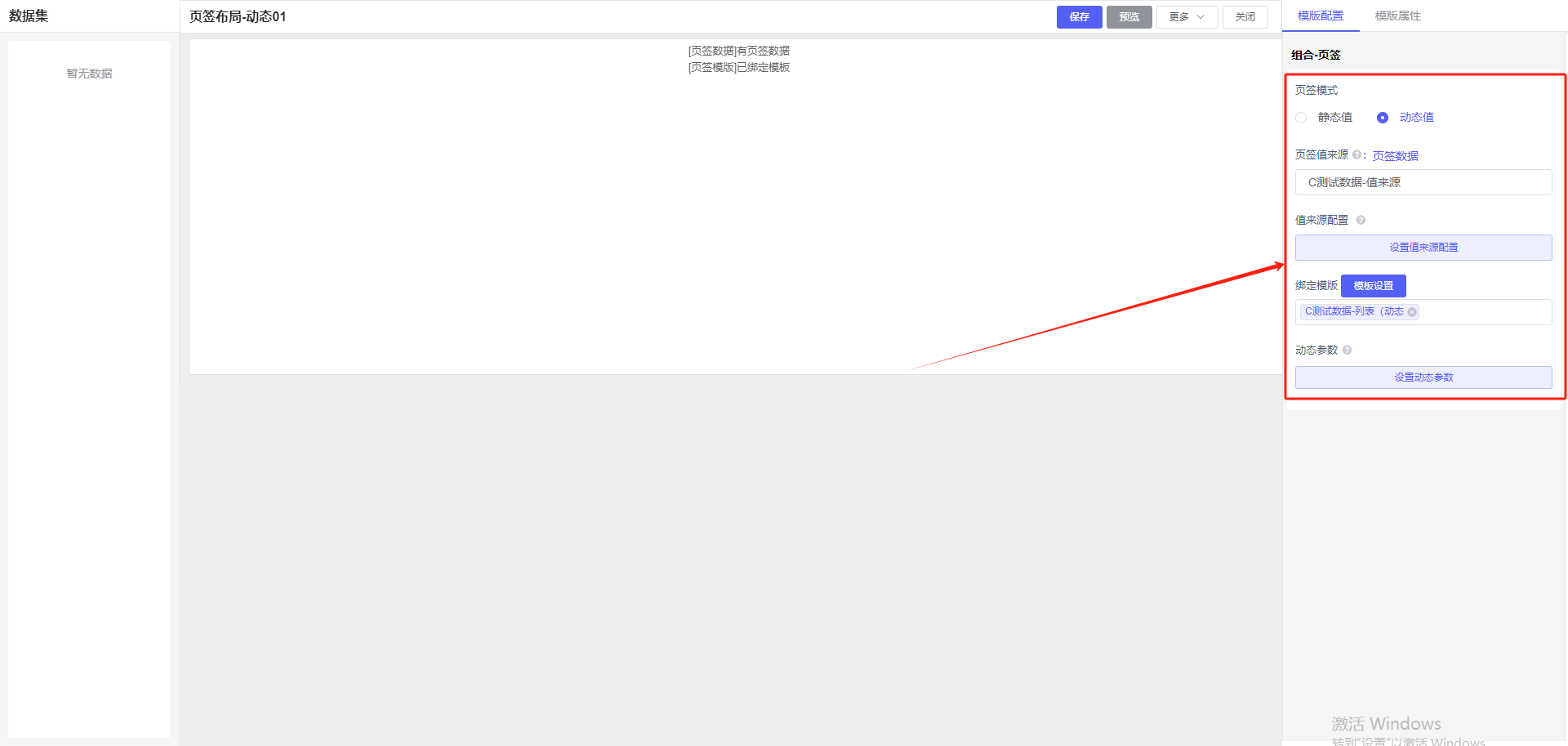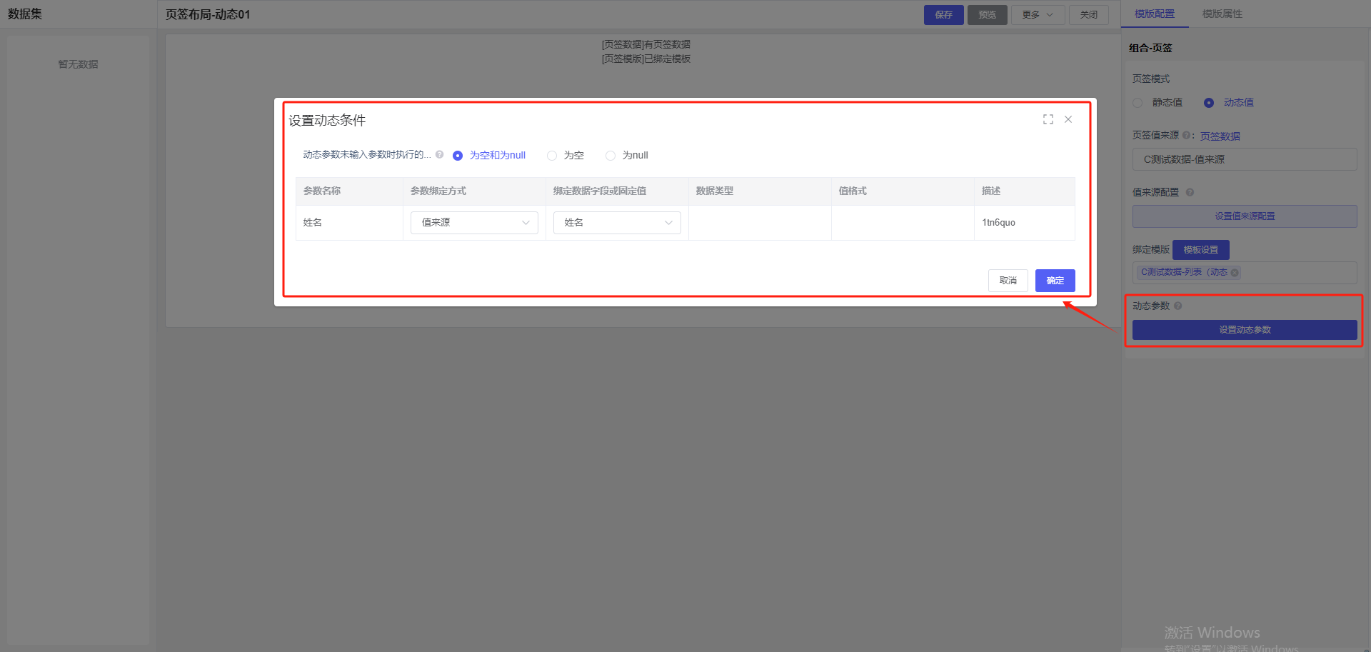③绑定模版:数据模板只能配置一个模板的数据,若选择的数据模板有配置动态的过滤条件,则需要将动态参数进行配置;