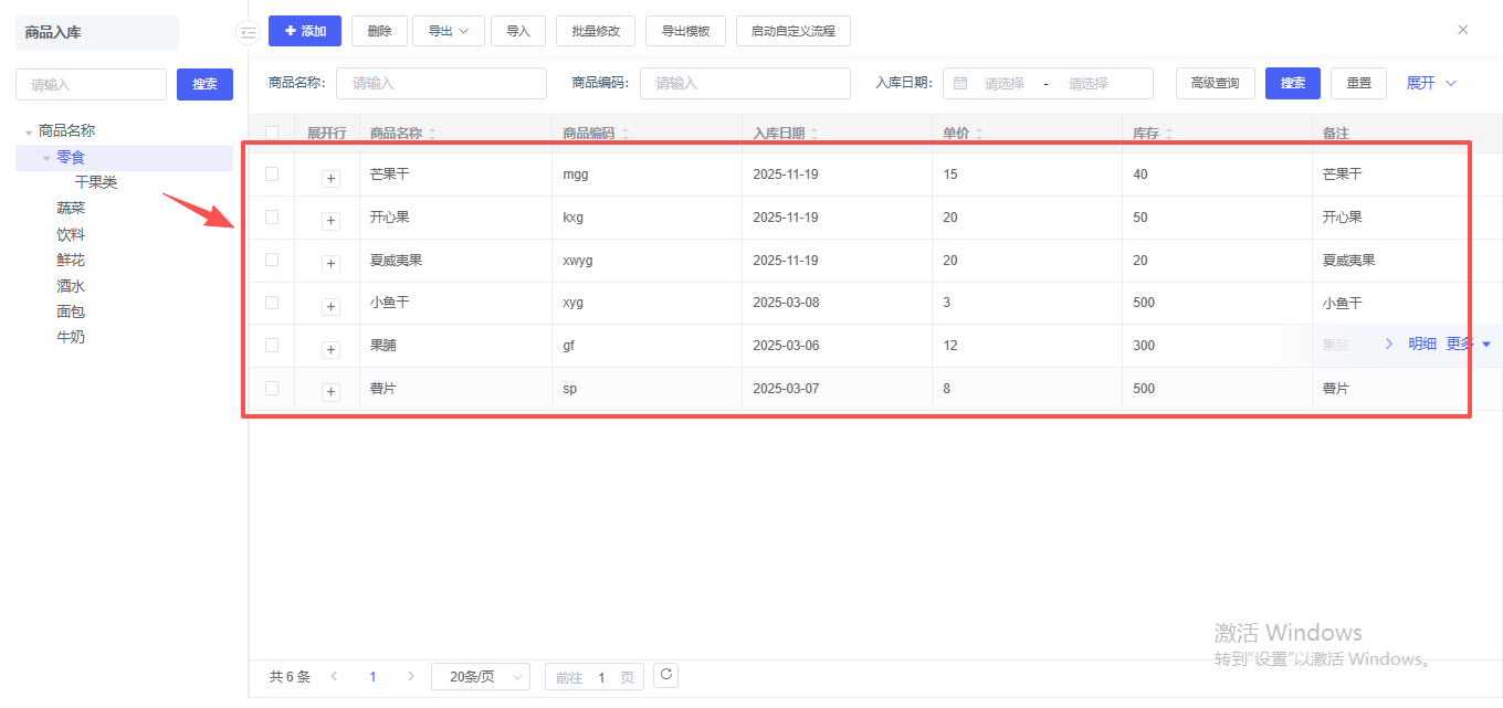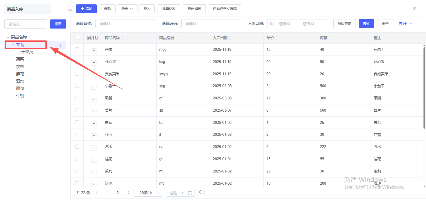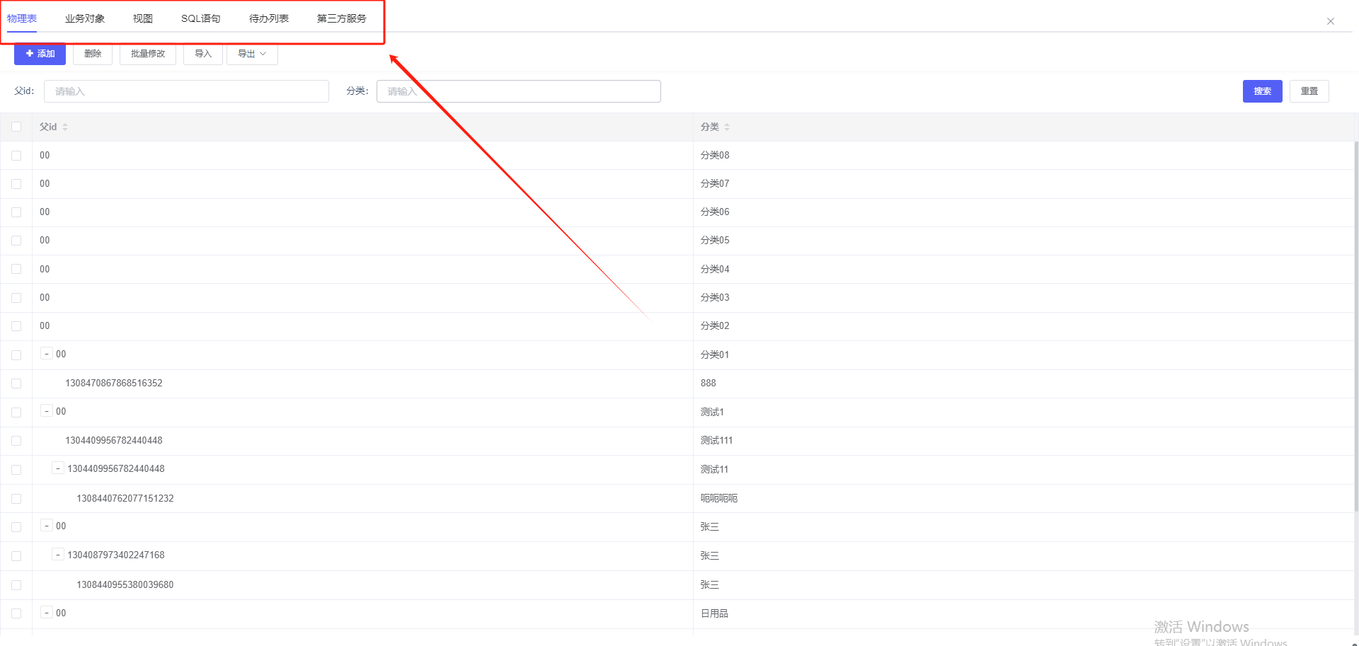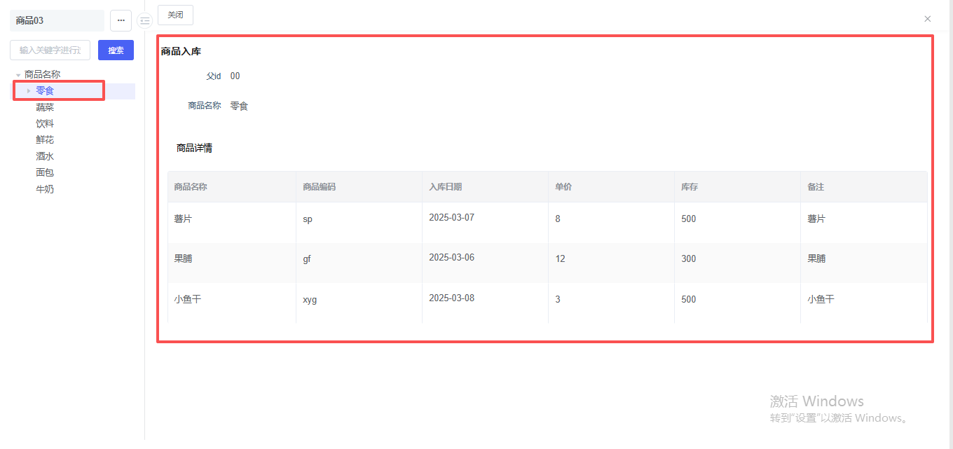 • 预览查看数据,选择点击左侧的树形数据,可筛选出于树形主键ID值相关联的数据。