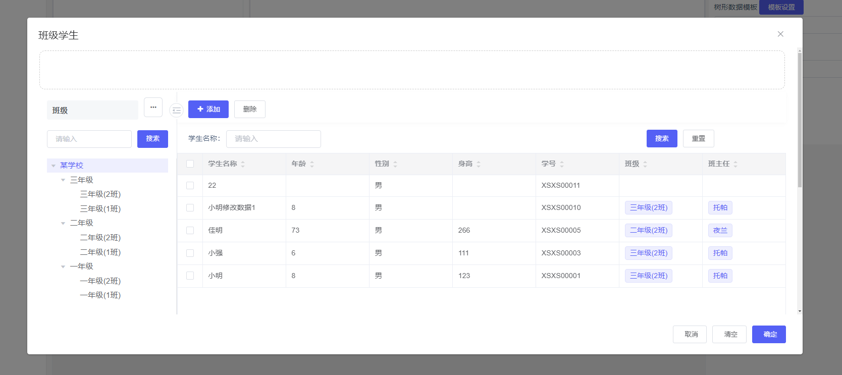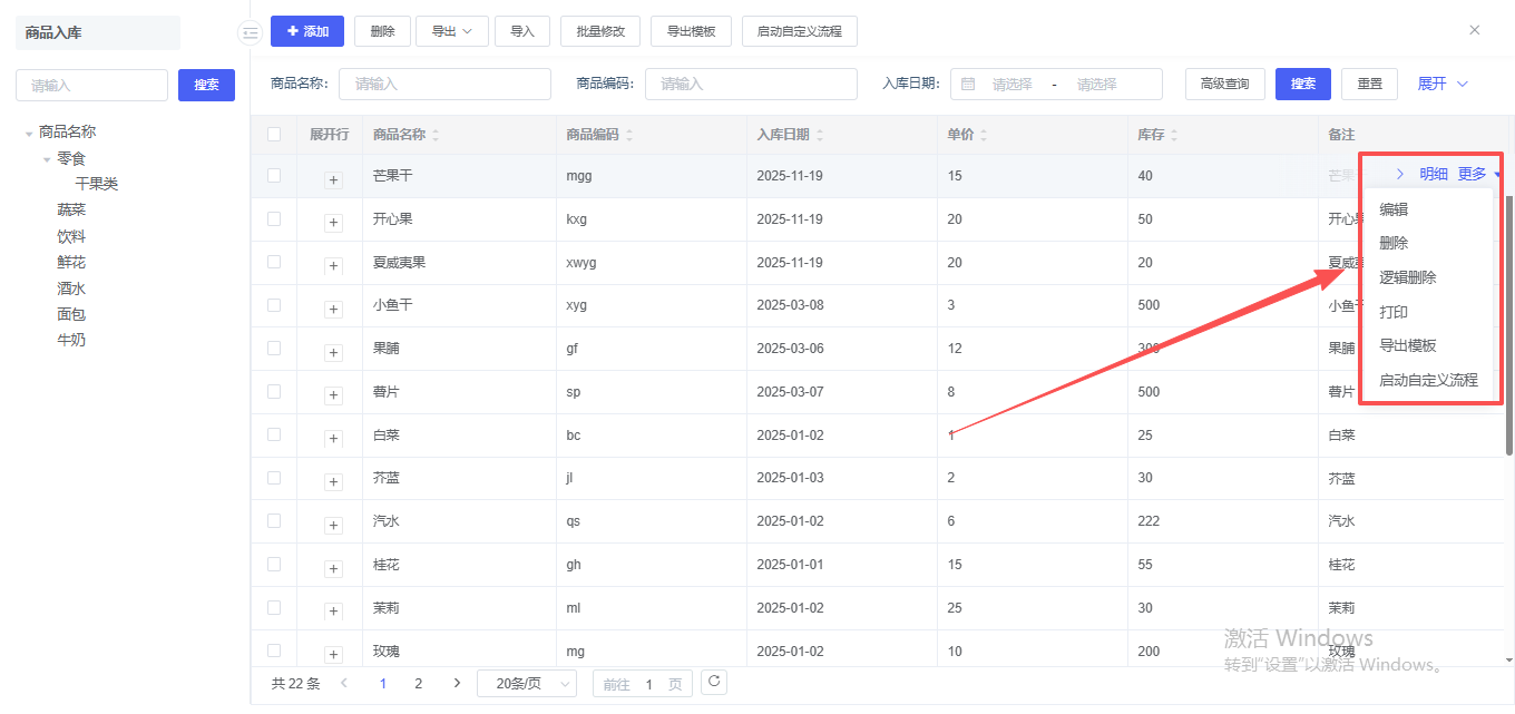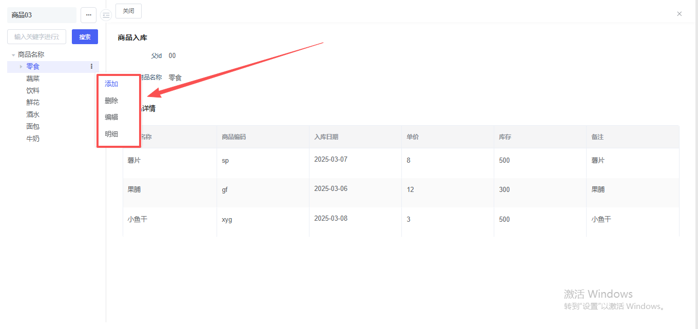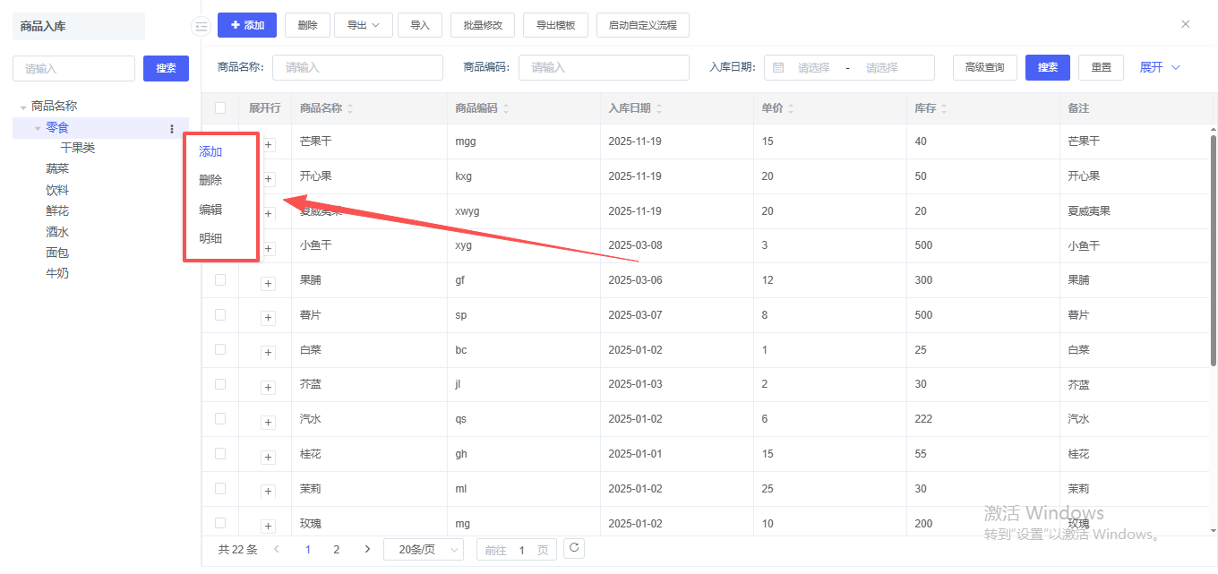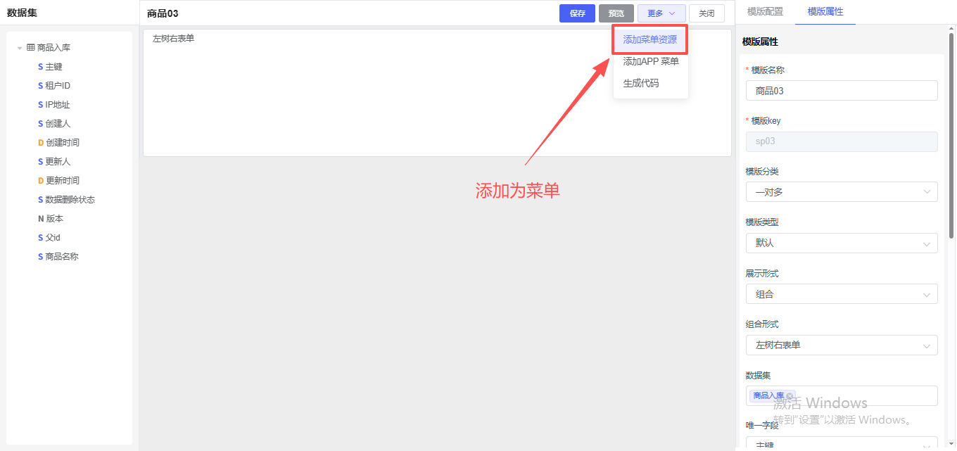 注意:树形的增删改操作需要树形模板设置“ 树形-右键按钮”。