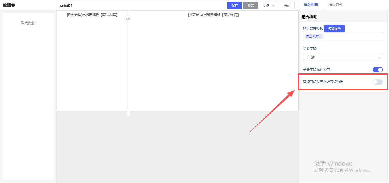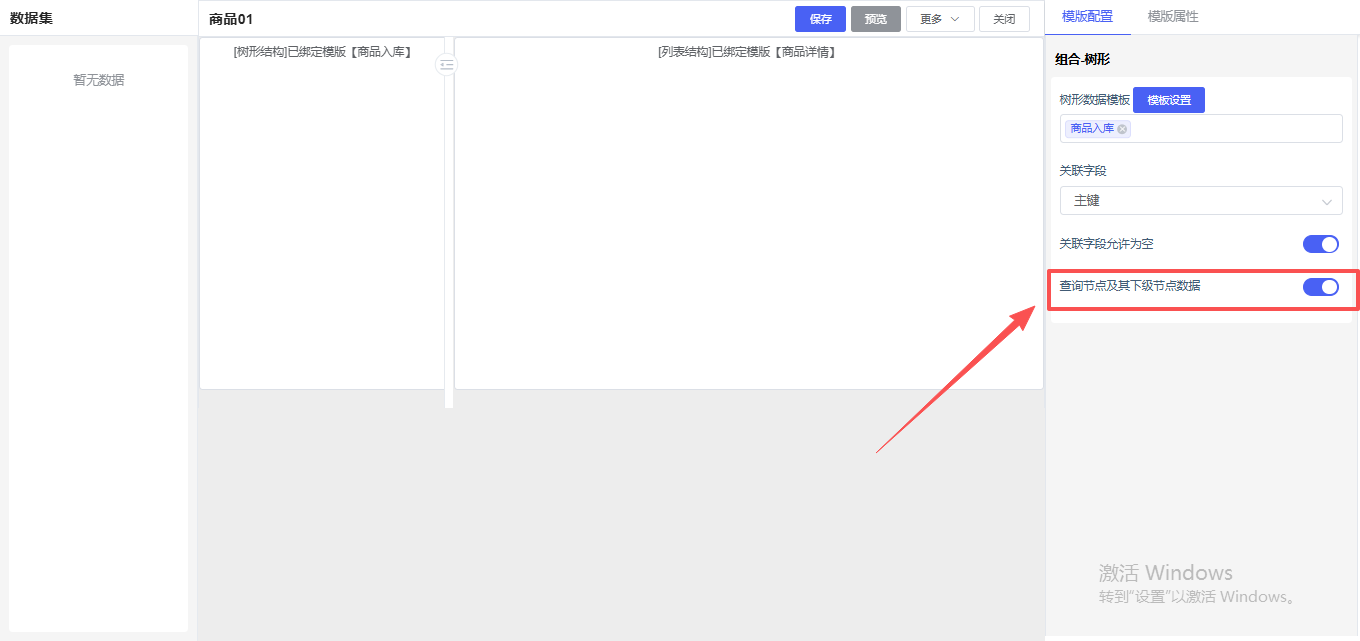 左树右列表、左列表右树组合模板设计页面,组合-树形的模板配置【是否查询节点及其下级节点数据】以达到查询节点及其下级节点数据功能。