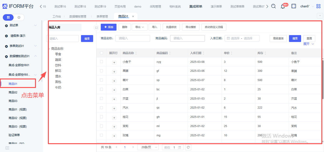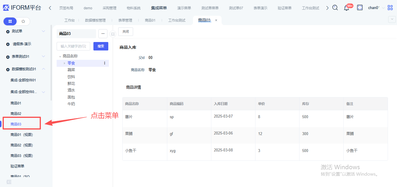 • 预览查看数据,选择点击左侧的树形数据,可查看树形数据对应的表单数据。