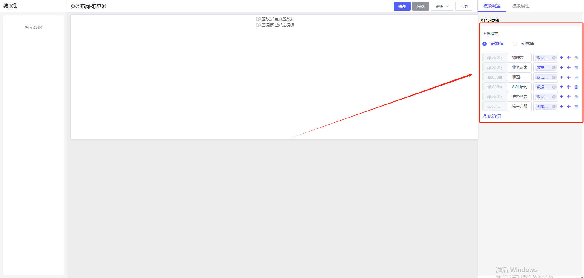 页签模式为静态值,只能绑定列表数据模板,且不带动态参数的数据模板。