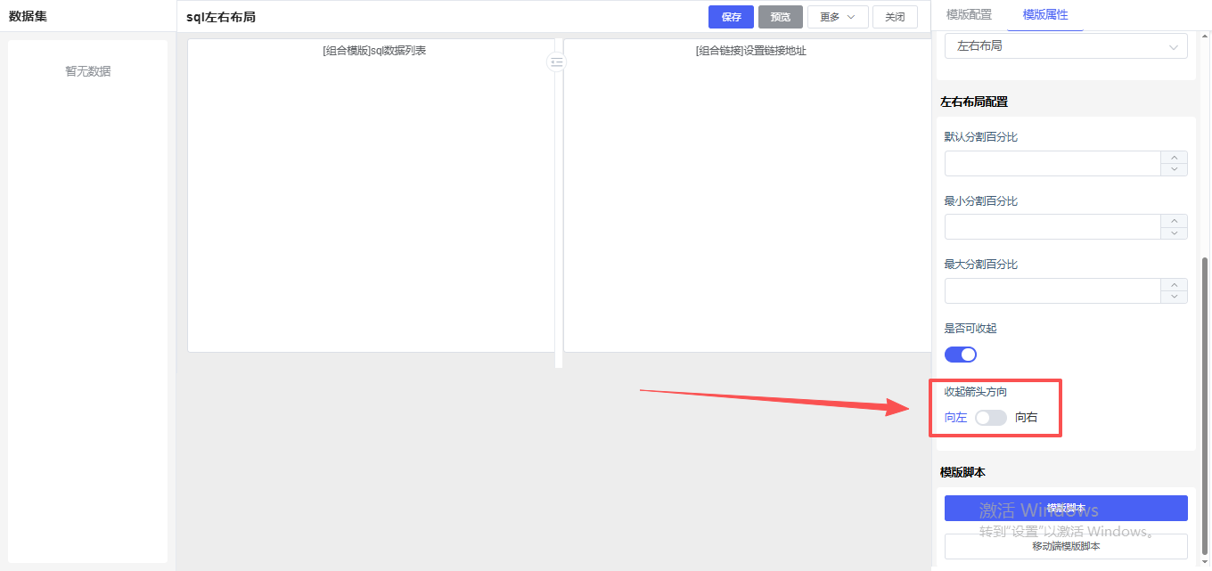 模板类型选择[默认],展示形式选择[组合],组合形式选择[左右布局],布局展示可选择[超链接向右,超链接向左]