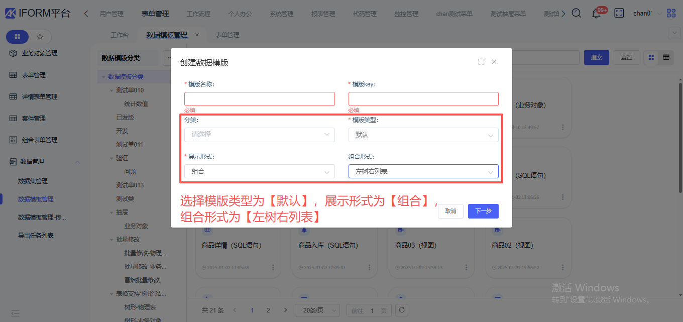 (1)第一步,需先创建树形数据模板和列表数据模板