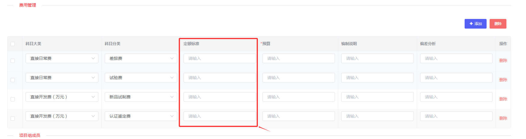 且判断“费用管理”的子表中,根据科目分类下的定额标准超与预算相差,超过10%,则按钮提交时:需提示填写对应当前行的“编制说明”和“偏差分析”,如下图: