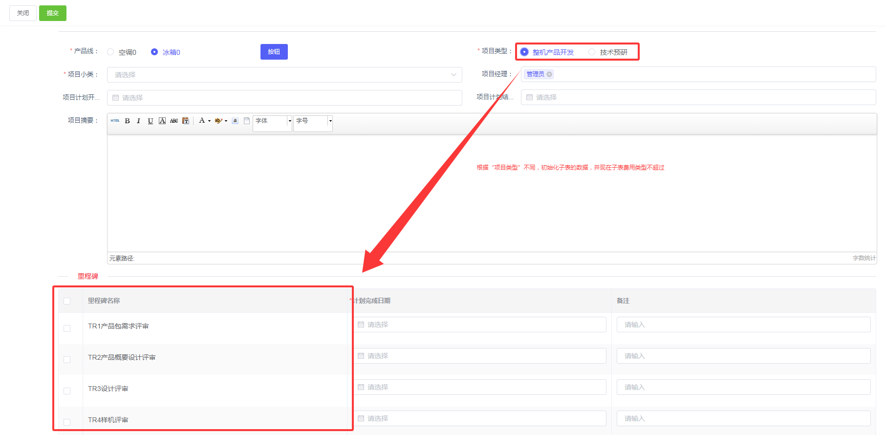 需求:在新建表单数据时,更加选择“项目类型”不同的数据,初始化子表的数据,效果如下图: