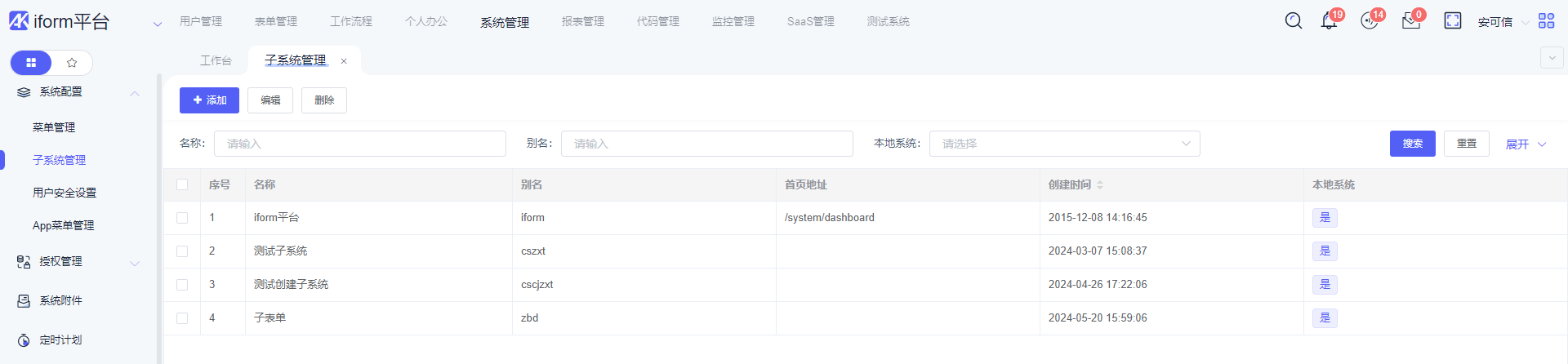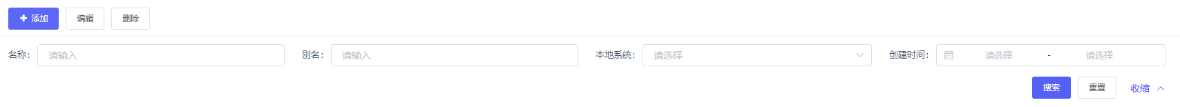 搜索:通过[名称],[别名],[本地系统],[创建时间范围]来查询列表数据