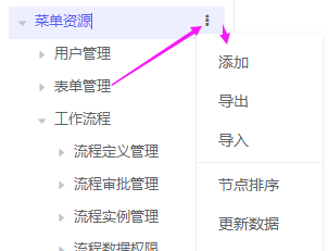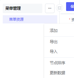 添加:添加下级菜单数据导出:导出菜单数据[导出数据格式.xml]导入:导入导出的菜单文件[导入.xml格式导入成功]节点排序:配置节点排序[排序下级数据]更新数据:更新菜单数据[更新最新的菜单数据,例如其他用户修改了菜单资源数据,刷新到最新的数据]