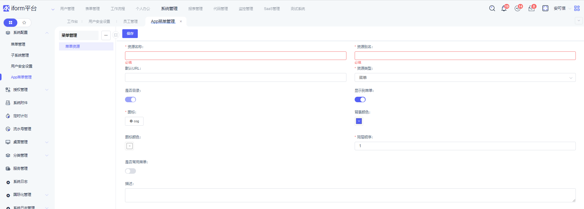 显示到菜单:选择”否“此资源将不在系统上方菜单栏中显示。是否目录:选择“否“资源将不能添加子节点