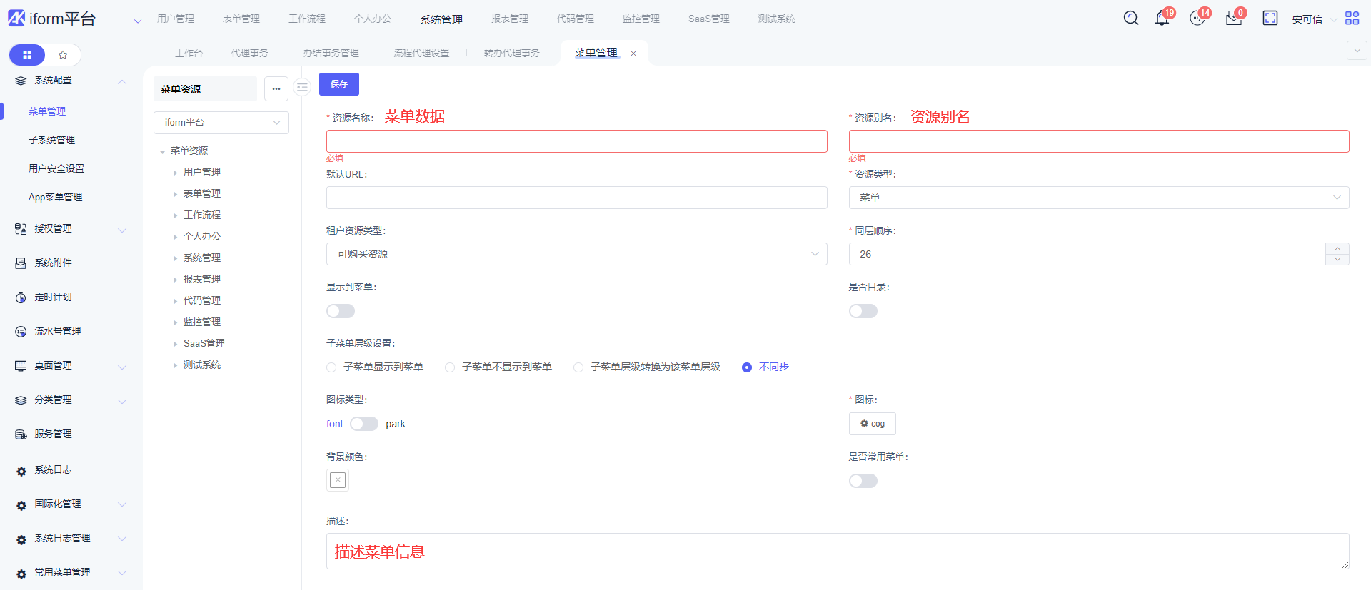显示到菜单:选择”否“此资源将不在系统上方菜单栏中显示。子菜单显示到菜单:设置后子菜单将会在系统上方菜单显示。