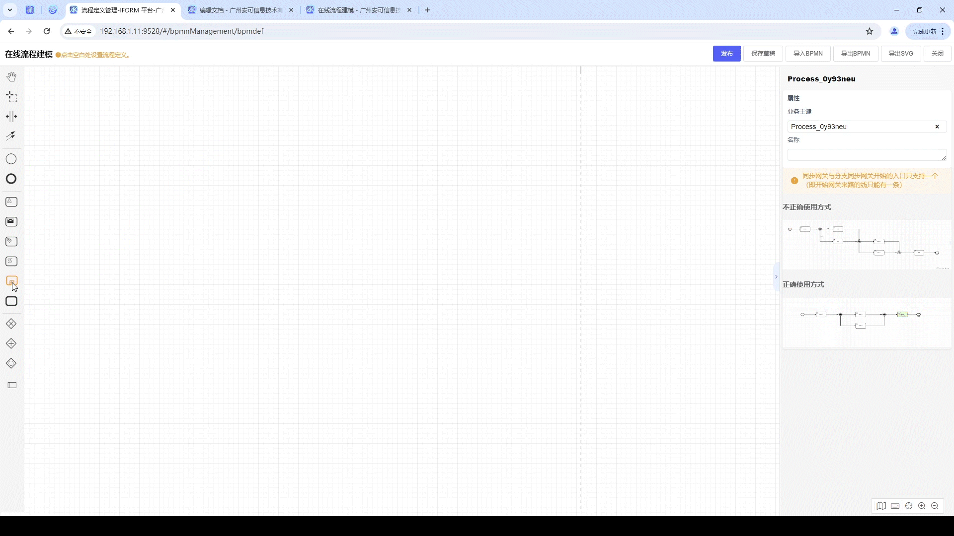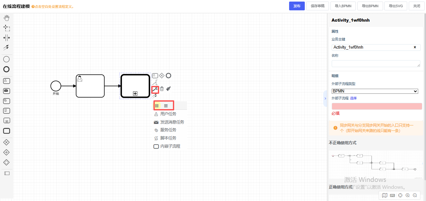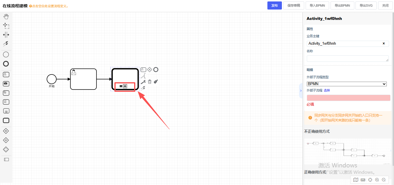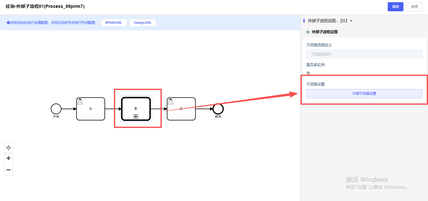 2、点击“在线流程建模”按钮,进入在线流程设计操作页面,设置“外部子流程”,绑定已存在的流程,如下图: