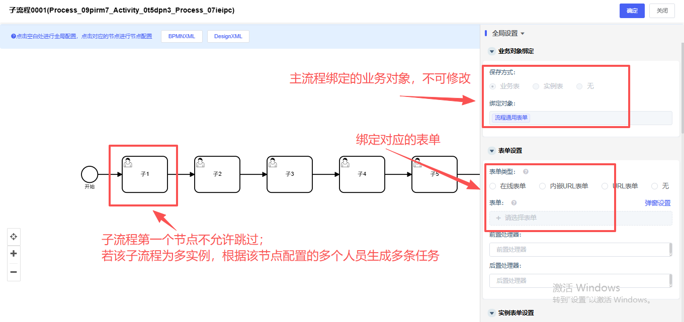 • 因为主子流程必须是同个业务对象信息,因此必须先在主流程的“全局设置”中的“业务对象绑定”信息。
